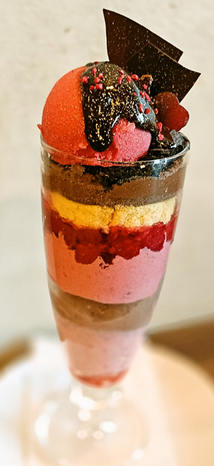 一番上には仄かに薔薇香る木苺のシャーベットとチョコソース。